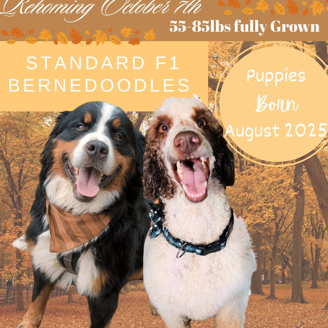 We are excited to announce our liter of 8 Standard F1 Bernedoodle puppies, born on August 12th 2025! These sweet babies will be ready for their forever homes on October 7th. There are 3 boys and 5 girls.